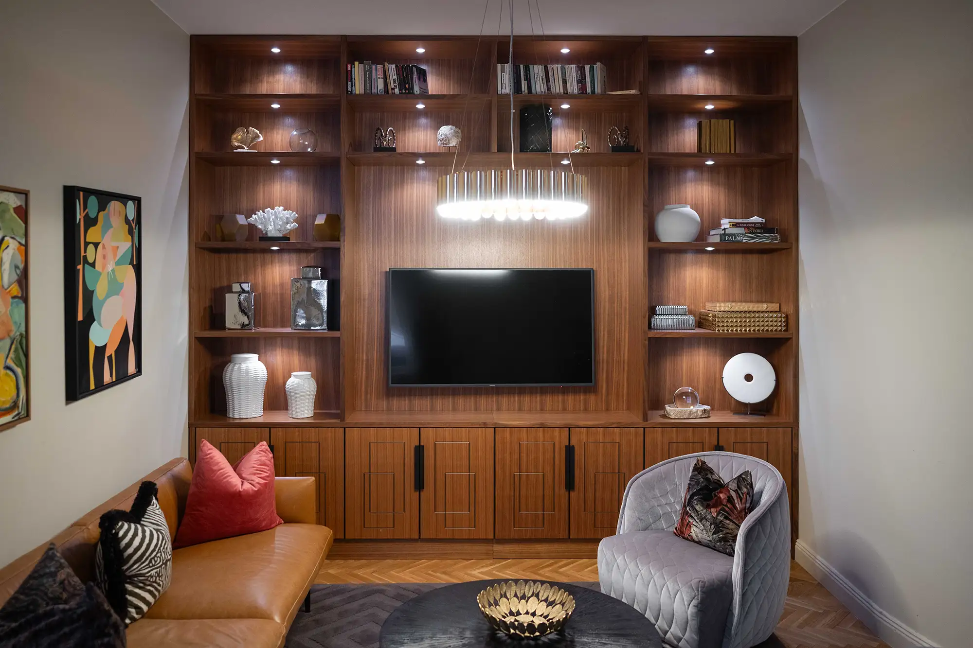 Bespoke fabrics and cushions complement specially commissioned artworks, creating a space that is both restful and inspiring.