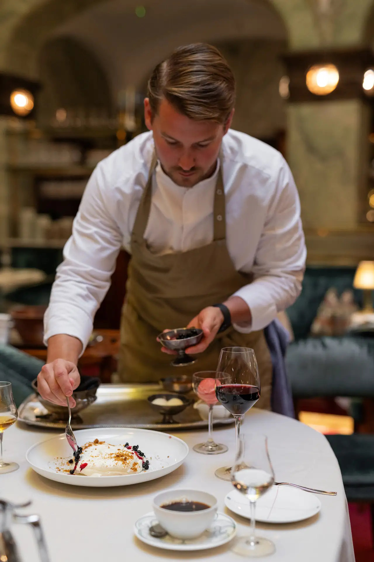 När “Smash the Piggy Bank” anländer till bordet, väntar en skulptural chokladgris – formad till perfektion och noggrant placerad mitt på tallriken. Spargrisen i mörk choklad är både vacker och aptitretande, med en glansig yta som lockar gästen att undersöka vad som gömmer sig inuti. Men här finns en twist: denna dessert kräver en extra liten insats från gästen. Det är nämligen upp till den som beställer desserten att själv “smasha” chokladgrisen för att avslöja de gömda skatterna.