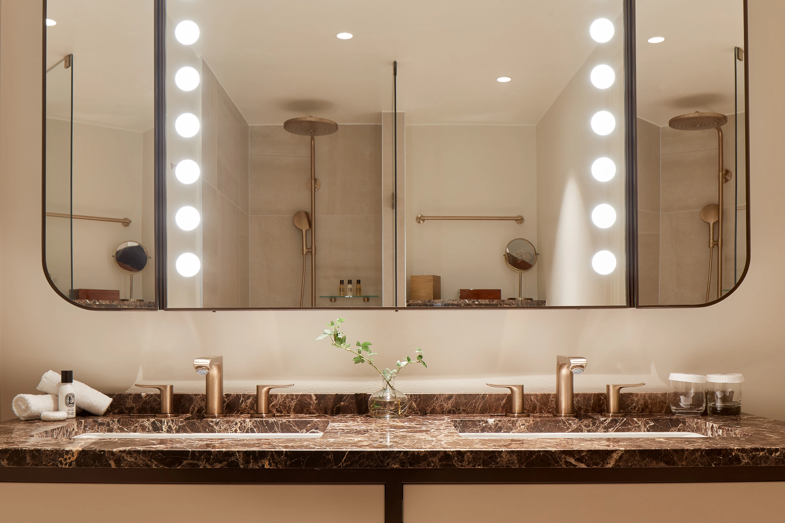 Tyger och textilier har valts med stor omsorg för att samspela med den specialbeställda konsten på väggarna och skapa en atmosfär som känns både rogivande och inspirerande. Badrummen präglas av elegans och kvalitet, där dekorativa inslag av marmor och brons tillför en subtil känsla av dekadens.